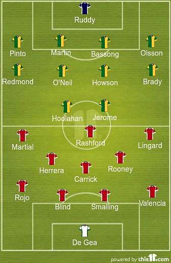 Manchester United (4-3-3): De Gea; Valencia, Smalling, Blind, Rojo; Carrick, Herrera, Rooney; Lingard, Rashford, Martial.