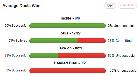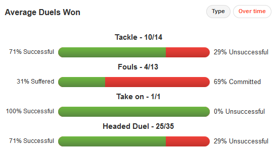 His pass accuracy will need to remain at the 86% mark to avoid any sloppy errors, while he will also look to add to the nine chances he has created for his colleagues in the attacking third.