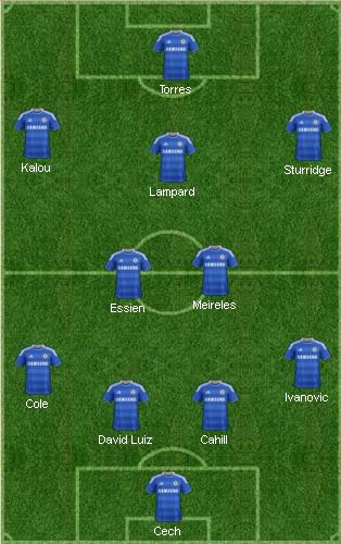 Cech , Ivanovic , Luiz , Cahill , Cole , Essien , Lampard , Meireles , Sturridge , Kalou , Torres.