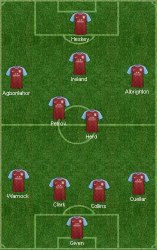 Aston Villa (4-4-1-1) :Given , Cuellar , Collins , Clark , Warnock , Herd , Petrov , Agbonlahor , Albrighton , Ireland , Heskey.