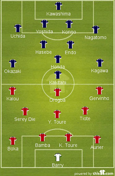Ivory Coast (4-3-3) : Barry; Boka, Bamba, K. Toure, Aurier; Die, Y. Toure, Tiote; Kalou, Gervinho, Drogba.