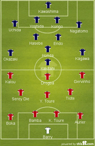 Japan (4-2-3-1): Kawashima; Nagatomo, Konno, Yoshida, Uchida; Endo, Hasebe; Kagawa, Honda, Okazaki; Kakitani