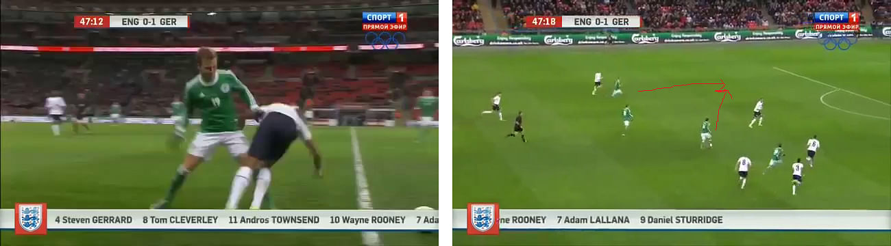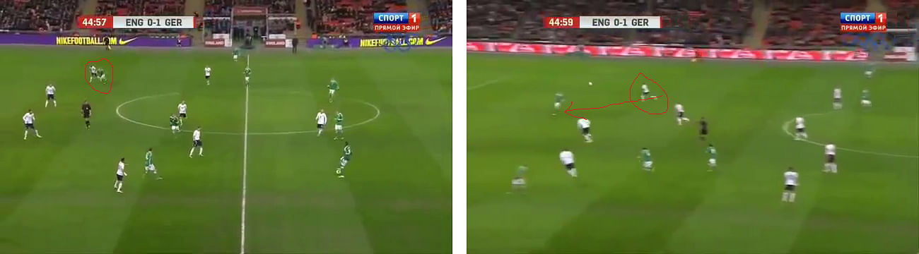 Throughout the match he struggled to keep up with the pace of the young Germans. Here is another example of his rustiness on the pitch; he loses the ball to Gotze, ultimately leading to a deadly counter attack. By the 52 minute Hodgson had seen enough of Cole’s miserable play, he called him off substituting him with Gibbs.