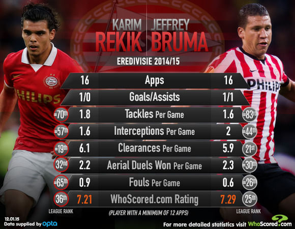 Regardless of external misgivings Cocu kept faith and has started to be repaid. By challenging them to adopt a take-no-prisoner mentality, thus becoming leaders, Bruma-Rekik has developed into one of the Eredivisie's more commanding pairings. They make the most passes in the PSV squad (47.3 and 47.4 per game, respectively), with both enjoying bringing the ball out of defence and starting attacks, while they also fare similarly well when it comes to interceptions. Bruma, the more strategic, is ahead (2.0 per game to Rekik’s 1.6) but is making fewer tackles (1.6 to 1.8). The two are coming on leaps and bounds; they are a microcosm of the club as a whole.Consistency has been at the heart of PSV's mini renaissance, and it's led to stronger cohesion and better understanding amongst the players. Seven of them have played 15 games or more, including both Rekik and Bruma. Another illustration of their progression is having four players in WhoScored's team of 2014/15 so far – the most by any side. Cocu struggled last term, making the odd rookie mistake here and there, but it was understandable.His appointment was a gamble, though a logical one given the direction in which PSV were heading. Despite serving on a temporary basis in the spring of 2012 (when he won the Dutch Cup), the fact remains that it was his first permanent managerial gig straight out of finishing school. A new economic reality meant policy shifted, with the focus now on youth and development, illustrated by the first team’s average age being 22.3 (the second youngest in the division). Looking towards Amsterdam, sporting director Marcel Brands knows cultivating a distinctive set of values, such as promoting from within and putting down deep local roots, can lead to a more sustainable future.