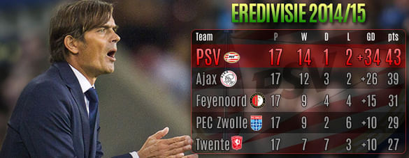 Going into 2014 the mood in Eindhoven was all doom and gloom with PSV languishing seventh, an eye-watering 11 points behind leaders and eventual champions Ajax. Heading into 2015 as 'winter champions', the Boeren have given themselves a wonderful opportunity to secure a first championship since 2008 under club legend Phillip Cocu. What a difference a year has made.Every journey starts with a single step and last season was no exception; despite creeping doubts – and supporter anger threatening to spill over – after losing 6 of their first 18 games, there were signs of better days ahead. Hindsight is a wonderful thing, but the keenest of observers during the bleak winter of 2013/14 predicted a recovery, partly because there was a long-term vision, and you can see what Cocu was attempting. Implementing a style of play – especially for teams who struggle to keep hold of their players – would be gradual.That promise is now being fulfilled. In terms of mental strength its chalk and cheese compared to last season. There's a sense of togetherness, no longer are they dropping their heads when the chips are down. Aad de Mos, who managed the club in the mid-1990s, credits the arrival of Mexican international Andrés Guardado (on loan from Valencia), their silent force in the middle of the park, as being the catalyst. The experience and warrior spirit he has brought has galvanised teammates who are desperate to break Ajax's monopoly.After 18 games PSV have tasted defeat just twice (a full four fewer than at this stage last season), won 14 matches (seven more) and scored 48 goals (13 more), but what is most encouraging – and it's been the cornerstone behind their revival – is their defence, which hasn't always covered itself in glory. Cocu's exemplary organisation skills have taken centre stage; no team boasts a meaner rear-guard (14 goals conceded); a stark contrast to 365 days ago when their against column (22) raised questions regarding the quality of their young central defenders – Jeffrey Bruma and Karim Rekik (on loan from Manchester City).