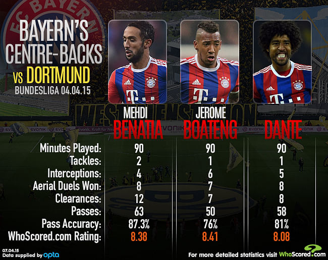 Certainly the defensive trio of Medhi Benatia, Jerome Boateng and Dante were fully concentrated. Their brief was to soak and smother – in a similar way to which other mere mortals have at Westfalen this season – and they did it excellently. Benatia completed 12 clearances, Boateng 6 interceptions and Dante 11 of both combined. They were clear-minded at the moments they needed to be, something that Dortmund have struggled with all season.