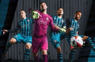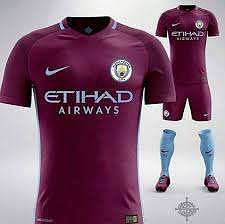 Man City’s away kit is claret in colour. A sky blue line goes around the neck and there are lateral insets which have been done in navy blue. It is definitely an upgrade on the home kit.