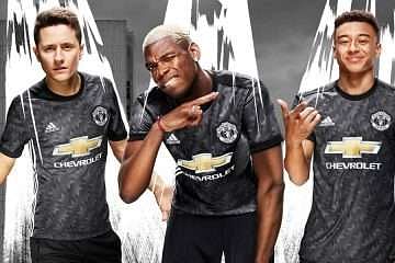 The Manchester United away kit is inspired by the cult classic blue jersey of 1990-92. It is black in colour with three stripes on each side on the body.