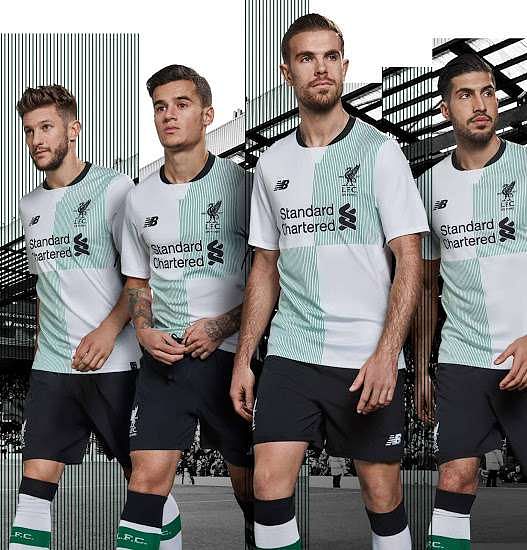 Liverpool’s second kit has the ‘quarter-design’ and is inspired by the 1996 classic. There is a pattern of green stripes on the upper left and lower right quarters.