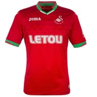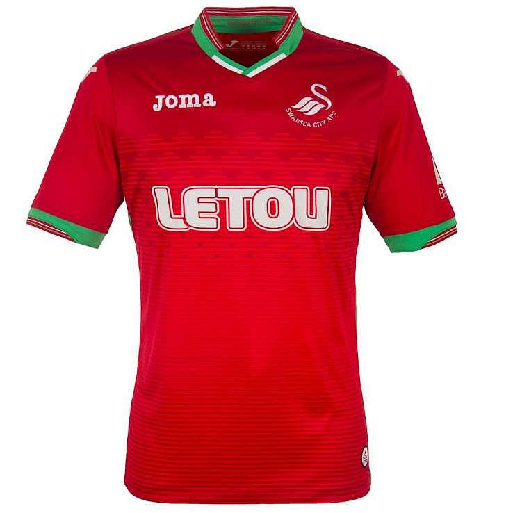 The Swansea away kit is red, green and white in colour and resembles Portugal’s international kits of the recent past. There are greens stripes along the sides of the body and there is more detail on the cuffs.