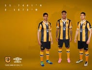 Umbro have done a good job with Hull City’s home kit for their return to the top flight of English football. Their kit sponsors have added a white trim on the y-neck shirt collar and sleeves and the look of the broad amber and black stripes should be quite appealing to fans who must be looking forward to a year of first division competition for their team.