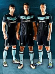 Their away strips are even better. They might be all black but the bright blue pin-stripes do more than enough to make the combination click. Unlike with other team kits, Adidas have retained the traditional triple stripes on the sleeve for West Brom.