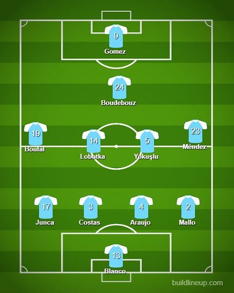 Celta Vigo: Ruben Blanco, Hugo Mallo, Nestor Araujo, David Costas, David Junca, Okay Yokuşlu, Stanislav Lobotka, Brais Méndez, Sofaine Boufal, Ryad Boudebouz, Maxi Gomez.