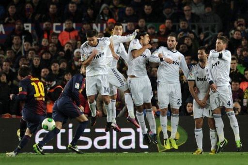 Barcelona’s Argentinian forward Lionel Messi (L) kicks the ball during the Spanish Cup semi-final second leg football match FC Barcelona vs Real Madrid CF at the Camp Nou stadium in Barcelona on February 26, 2013. Real won 3-0.