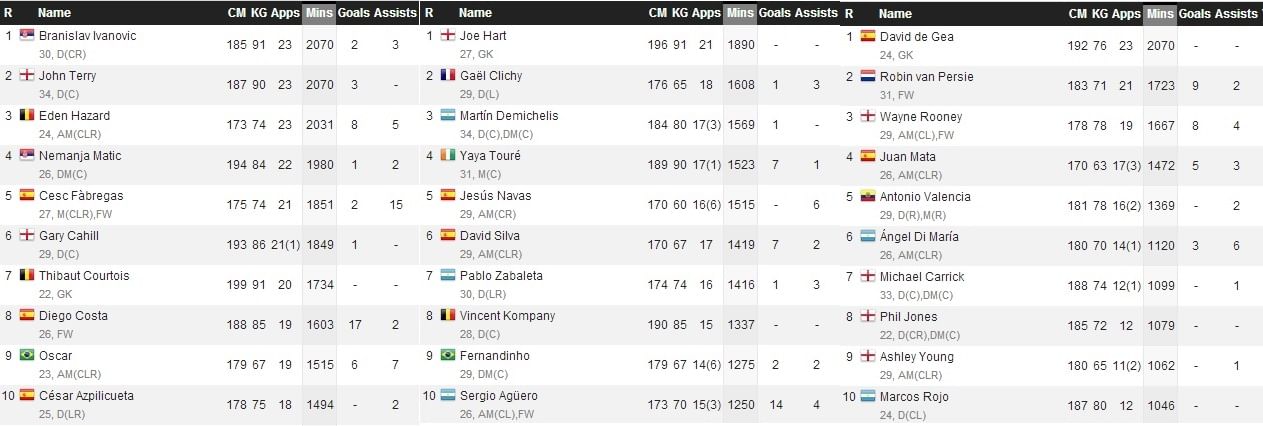 Like with Real, Chelsea’s players have considerably more tread. Branislav Ivanovic and John Terry have played a massive 2,070 minutes in the league with Eden Hazard also clocking in excess of 2,000. The Blues have nine players who’ve played over 1,500 minutes. Chasing City have just five and Manchester United in third have only three.