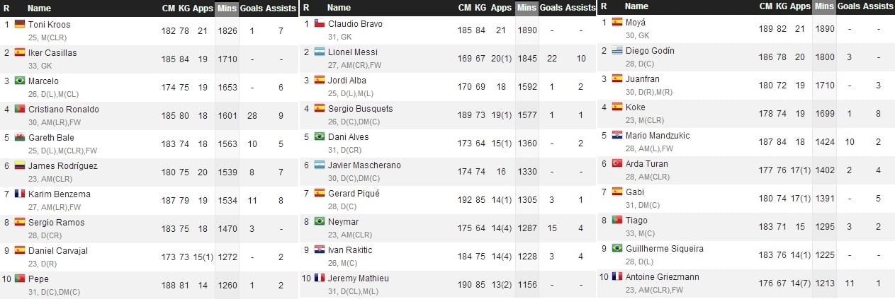 Overall, Kroos is the minutes leader in the league for Real having played 1,826 minutes followed by Iker Casillas (1,710) and Marcelo (1,653). Ronaldo is fourth with 1,601 minutes for those curious. The Liga leaders have seven players who have clocked more than 1,500 minutes.