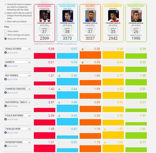From the above comparison matrix created using Squawka, it is clear that Mane is far behind the other players in terms of creating chances. He is better than Coutinho at completing take ons, but is nowhere near the likes of Sanchez, Hazard and Mahrez at their best. However, when it comes to defensive contribution, which is very important to Klopp, Mane is almost as good as Sanchez and much better than Coutinho.