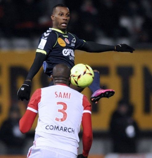 Reims’ forward Odair Fortes (L) clashes with Nancy’s defender Joel Sami during a French L1 football match at Marcel Picot Stadium on February 9, 2013 in Tomblaine. Second-half goals from Floyd Ayite and Fortes earned Reims a 2-1 victory at basement club Nancy.
