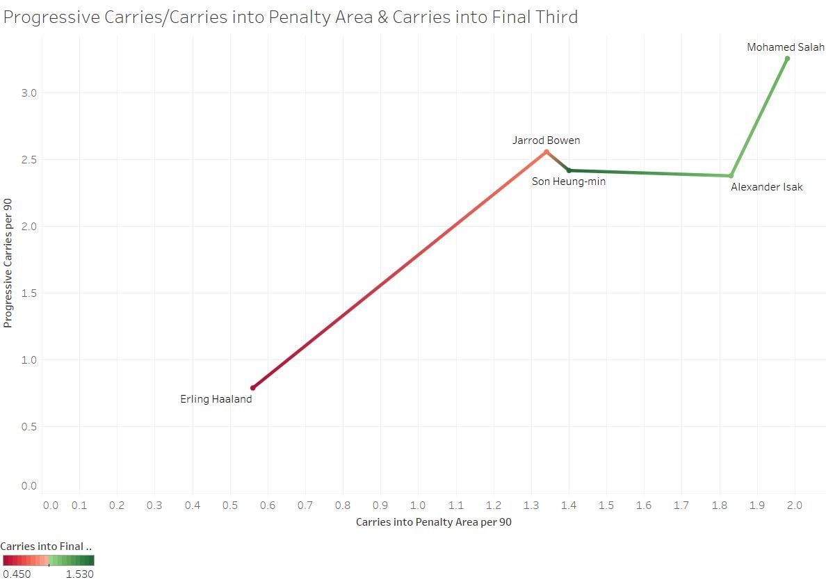 Son's point is the darkest green on the graph as he averages 1.53 carries into the final third, beating Salah (1.16) and Isak (1.10). The Tottenham Hotspur man is attempting a higher volume of final-third carries, while also taking a majority of them into the box.