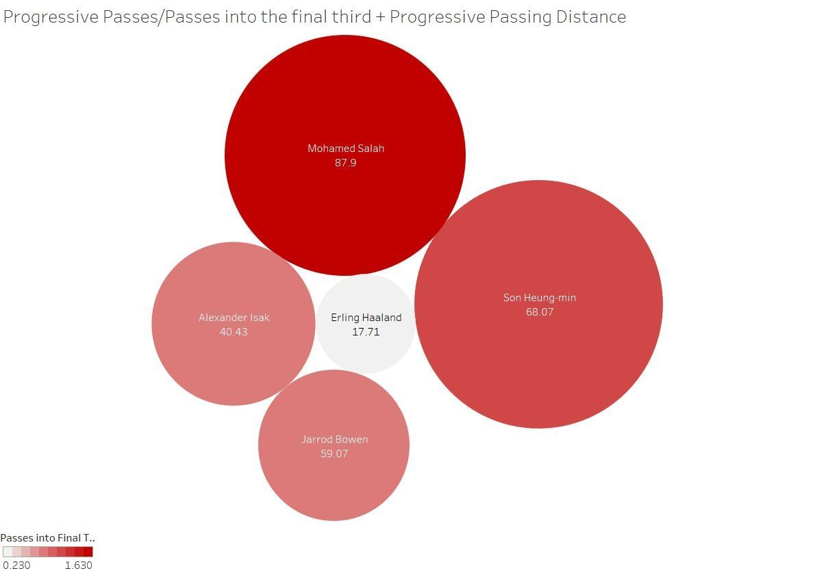 What is also interesting is that while Salah's bubble is the brightest red, it is not the largest in size, which indicates total progressive passes played per 90. Son is clear of his competition here with 4.21, though Salah is not far behind at 3.96.