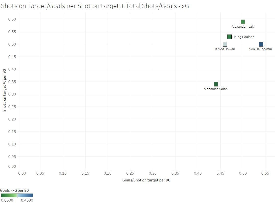 However, Son has been the best at converting his shots on target into goals per 90 (x-axis), which happens 54% of the time. The margins here are much smaller, with Isak (50%), Haaland (47%), Bowen (46%) and Salah (44%) not too far behind.