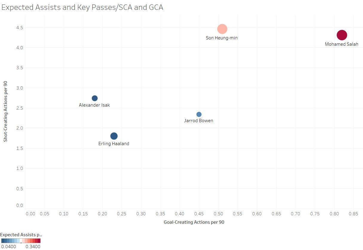 The key passes per 90 element, illustrated by the size of the mark on the graph, is also in Salah's favor as he has averaged 2.33 of those per season compared to Son's 2.17. Haaland's circle is visibly bigger than those of Bowen's and Isak's as he has averaged 1.13 in comparison to 0.73 and 0.56 by those two respectively.