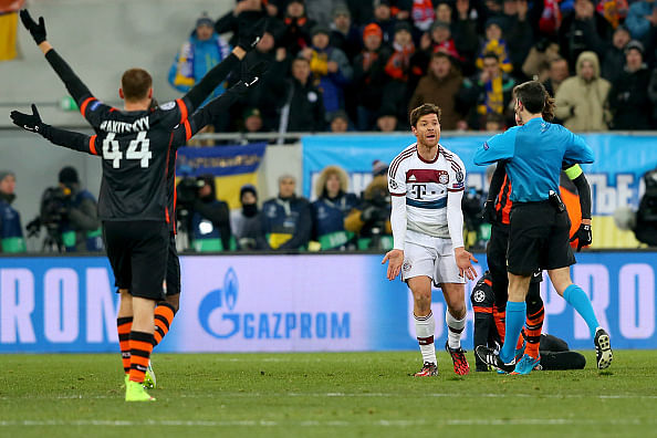 Shakhtar managed just one shot on target despite being the home team. Bayern were penalised for 20 fouls and were issued five yellow cards. Xabi Alonso, who was dismissed in the 65th minute, accounted for two of them.