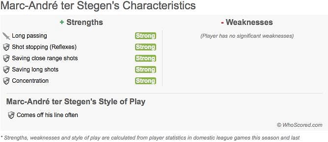 His average of 7.5 and 7.3 accurate long balls per game in the Champions League and U21 Euros respectively also stand him in good stead and, importantly, are both better than Bravo. This only accentuates Ter Stegen’s statistically calculated WhoScored strength of ‘long passing’, with the German clearly a commendable performer with the ball at his feet, a much-needed trait for the modern-day goalkeeper.