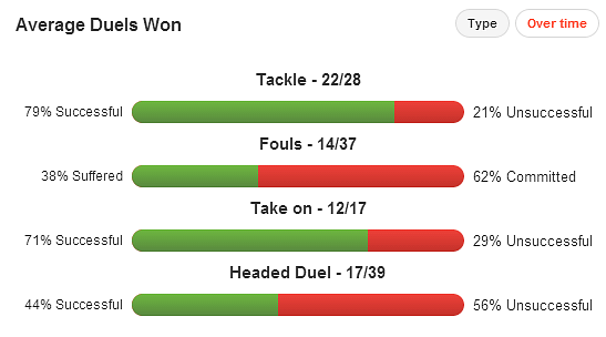 So far this season, featuring largely in central midfield, Xhaka has completed 88% of his passes, which includes 41 long balls, setting up eight chances in his eleven appearances. He also completed 71% of the 17 attempted take-ons he makes per game. These are impressive numbers, numbers that show just how hard working he is off the ball and efficient when on it.