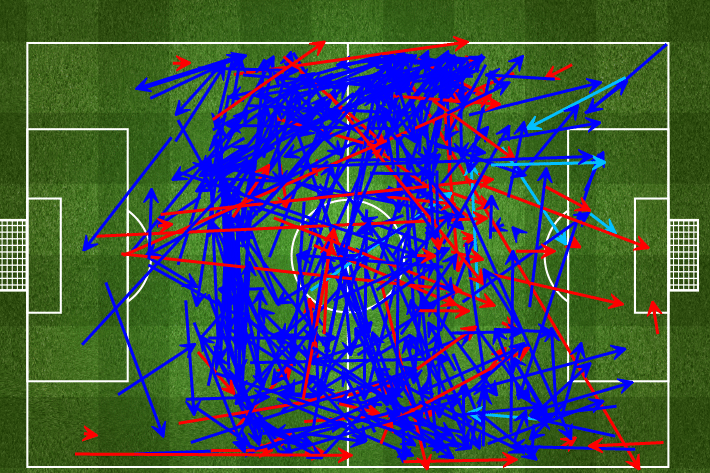 Indeed, a look through their overall passing map shows them passing between themselves in defence or going down the wings mostly, ignoring the middle. This made their gameplay predictable as they were forced to go down the flanks and mostly cross the ball in.