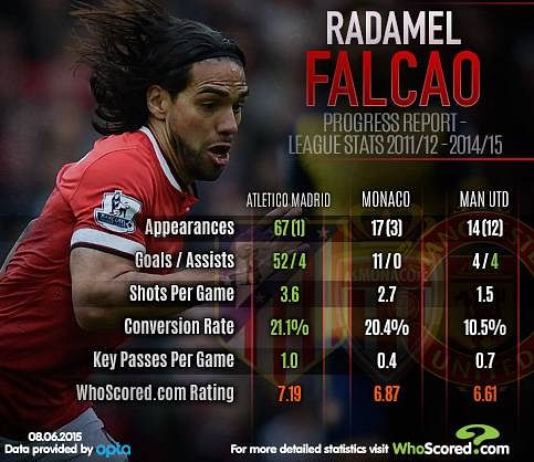 It’s Falcao, though, whose form has been most suspect. By WhoScored.com rating, he was only the 21st best player at United last season, scoring just four goals in 26 games. The decline set in during that season in Monaco.