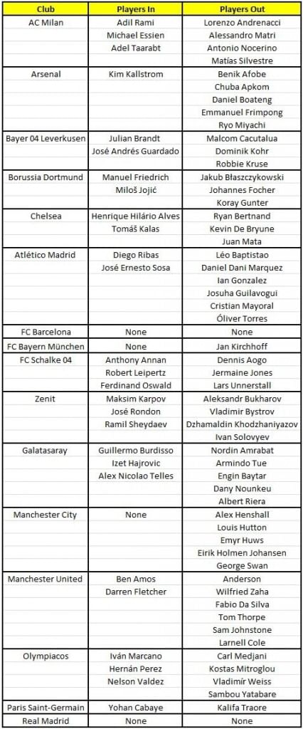 The 16 teams taking part in the UEFA Champions league knock-out phase have finalised their squad changes with Paris Saint-Germain’s Yohan Cabaye and AC Milan’s Michael Essien being the big changes.