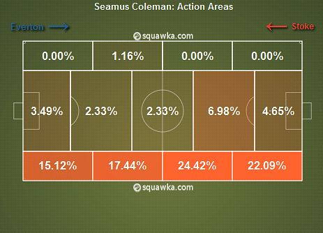 Everton duo Coleman and Jagielka have also kept three clean sheets from a possible four in the month of November, although the Toffee’s did concede three in their derby draw with Liverpool.Coleman has also contributed a goal to the cause, in the 4-0 win over Stoke City, as well as four key passes whilst bombing forward from right back (evident in the Action Areas Map above.)