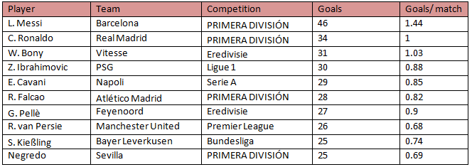 There are a couple of surprise names in the top-1o. Wilfried Bony (Vitesse) and G. Pellè (Feyenoord) have had fantastic seasons in the Eredivisie, scoring 31 and 27 goals respectively. Bony has scored his goals at a rate of 1 goal/match, bettered only by Messi.