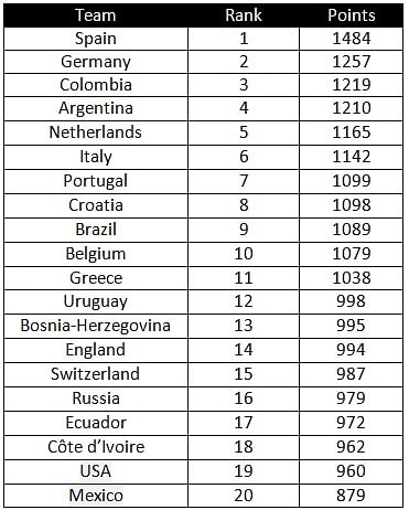 United States of America have entered the list of top 20 after climbing up 3 spots from their previous ranking. Top 20 teams at FIFA are: