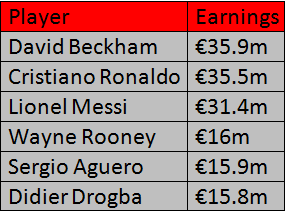 David Beckham may have retired from football but he still leads the list with €35.9 m, followed closely by Cristiano Ronaldo with €35.5 m.