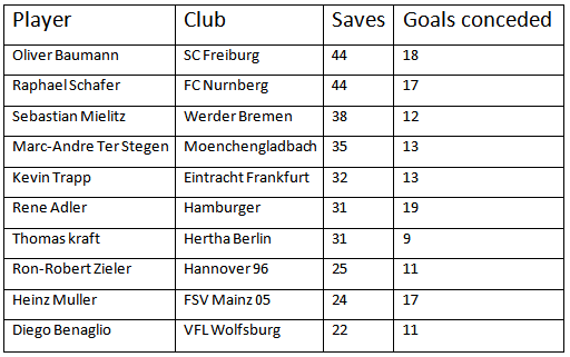 The table below shows the performance of the best goal keepers in Bundesliga so far.