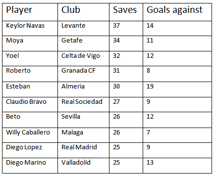 The table below shows the performance of the best goal keepers in La Liga so far.