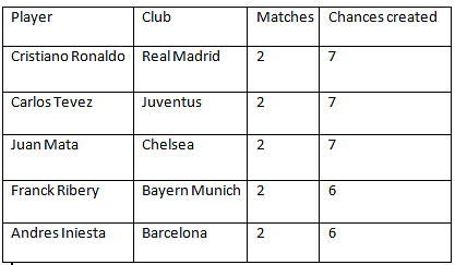 Cristiano Ronaldo is at the top of the list of players with most chances created in Champions League so far. He has created 7 chances in 2 matches for Real Madrid. He is followed by Juventus’s star striker Carlos Tevez. The Argentine forward too created 7 chances in his 2 games in Champions League.