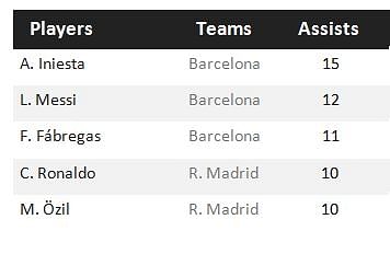 Iniesta of Barcelona tops the list with 15 assists. Interestingly, the top three spots are hogged by Barcelona.