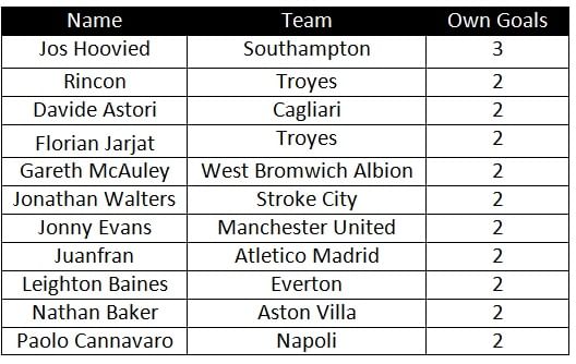 Jos Hoovied, playing for Southampton, had the most number of own goals (3) in the 2012/13 season. Full list below: