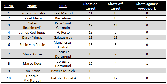 With an amazing 41 shots on target so far this season, Real Madrid’s Cristiano Ronaldo tops the chart with the most number of attempts. Four time Ballon d’Or winner Lionel Messi is in second place with 26 shots on target. Manchester United marksman Robin Van Persie is sixth spot with just 16 attempts on goal.