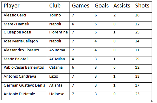 Alessio Cerci of Torino has scored the maximum number of goals so far, 6 in 7 games. He is followed by Napoli’s Marek Hamsik, who has scored 5 goals from 6 games.