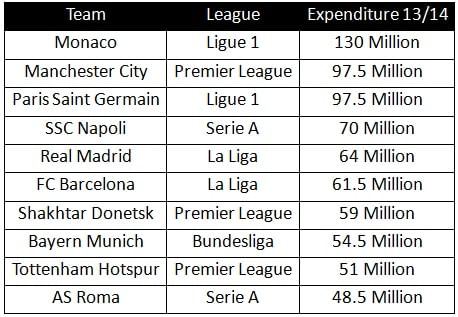 Monaco has been the top spending club in this years summer transfer window spending £130 million. On the other hand Edinson Cavani was bought for 57,000,000 £ by Paris Saint-Germain and is also the top buy in this years transfer window. Here’s the list of top spending clubs in 2013/14 transfer window: