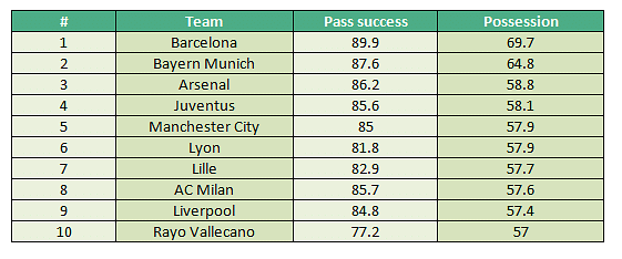 In terms of possession, Barcelona have had the highest in Europe, with an average rate of 69.7%. With the tiki-taka style of play, they have achieved a staggering 89.9% pass rate, followed by Bayern Munich, who have an 87.6% pass rate.