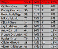 Even though, Danny Graham failed to score for Sunderland last season, but has the best shooting accuracy out of all of the players in this table, with 61% of his shots hitting the target, while Carlton Cole has 52% of his shots on target.