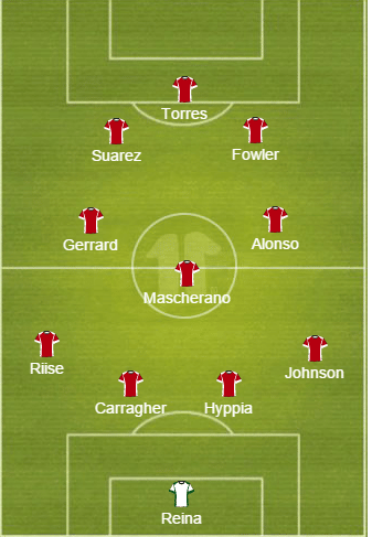 Goalkeeper: Pepe Reina; Defenders: Glen Johnson, Jamie Carragher, Sami Hyypia, John Arne Riise; Midfielders: Xabi Alonso, Javier Mascherano, Steven Gerrard; Strikers: Robbie Fowler, Fernando Torres, Luis Suarez.