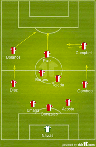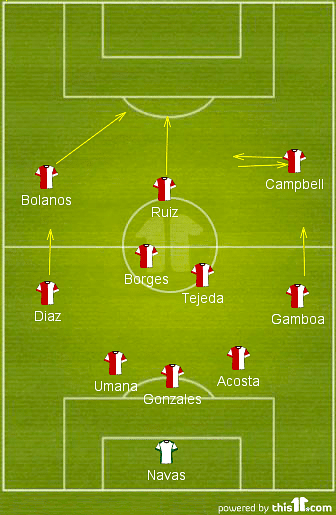 Los Ticos were unchanged, barring Duarte having to sit this one out for his red card against Greece. Acosta was drafted in for him. As far as the lineup was considered, Campbell played the first half on right flank, trying to get the ball and link play with Bolanos and Ruiz.