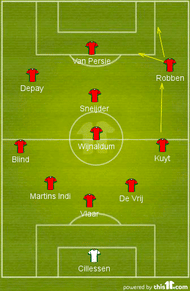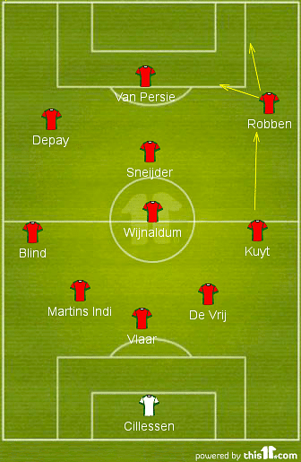 The rumors before the game suggested Van Gaal would deploy the speedy youngster Depay as a left wingback in a five men back line while continuing with Daley Blind in the centre of midfield. Rather, he slotted Blind at left wingback while Memphis Depay started ahead of him as an attacking outlet on the left. Robben had his freedom on the other flank, trying to use his speed to good effect.