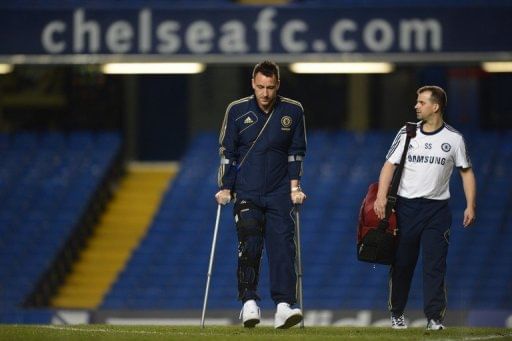 Chelsea defender John Terry (left) walks on crutches after the Premier League match between Chelsea and Liverpool at Stamford Bridge in London, on November 11. Chelsea captain John Terry will be sidelined for about three weeks after injuring his knee against Liverpool last weekend, Blues coach Roberto Di Matteo revealed.